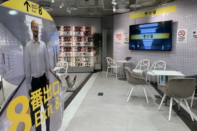 衣装とあわせて、栄駅の「8番出口」の方向を案内してくれているような気がしたのですが、よく見ると、劇中の「8番出口」の案内看板でした。さらに店内に入ってみると奥の休憩コーナーには映画『8番出口』の特別装飾が施されていて、河内大和さんが演じる“歩く男”の大きなスタンディや「8番出口」の看板、モニターには映画『8番出口』予告編映像とあわせて、二宮さんから名古屋の皆さんに向けたメッセージ動画も流れていました。