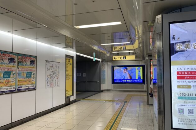 栄駅に到着し、まずは「8番出口」を目指します。普段は出口番号などあまり気にすることがないので、黄色い出口誘導板に「8」を見つけるだけでワクワクが加速します。構内を歩いていると、そこかしこに”映画『8番出口』異変探しラリー”のポスターを発見しました。