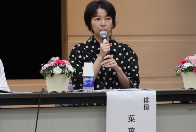 主人公の金子文子を演じた菜葉菜さんは、「私はこの映画祭の参加は今回で3度目なんですが、すべて浜野監督に連れてきていただきました。明日が本作の世界初公開になるので、大変光栄に思っています」と挨拶し、「浜野監督の作品は、丁寧に誰よりも熱い思いで作られています。その思いに私も乗っかり、主演としての重圧もあるけれど、役者としてそういう作品や役に出会えて、役を託していただけるという環境はなかなか貰えない幸せなことだと思っています。今回の金子文子も全力で、皆で丁寧に熱い思いで作りました。私は堂々と金子文子を演じ切ったと言いたいと思います」と胸を張りました。