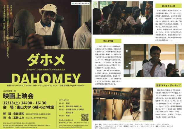 - 12/13(土)2025年度第一回映画上映会『ダホメ』(主催:南山大学人類学博物館・南山大学人類学研究所)