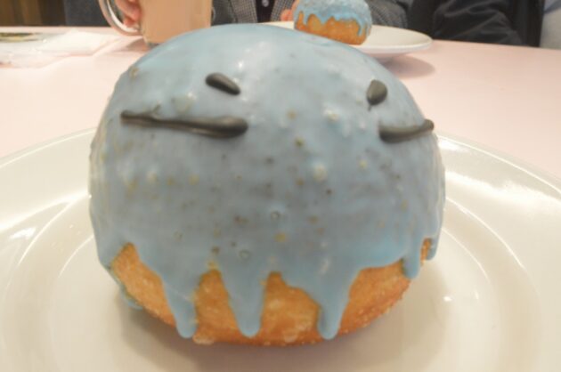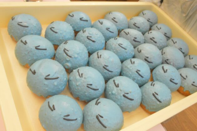 リムル様の色味を再現したホワイトチョコレートがかけられた丸形のドーナツに、ひとつひとつチョコペンでお顔が描かれています。よく見るとひとつひとつの表情が異なるかもしれません。
