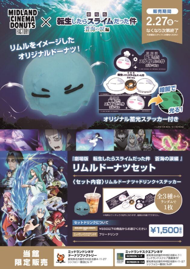 2月27日(金)よりミッドランドシネマ ドーナツ ファクトリーにて『劇場版 転生したらスライムだった件 蒼海の涙編』オリジナルコラボドーナツセットが期間限定で販売されます。主人公リムルをイメージしたオリジナルドーナツ 1点 とソフトドリンク 1点 、ステッカー1枚(ランダム・全3種)をセットにした名古屋でしか買えない オリジナルコラボ商品です。